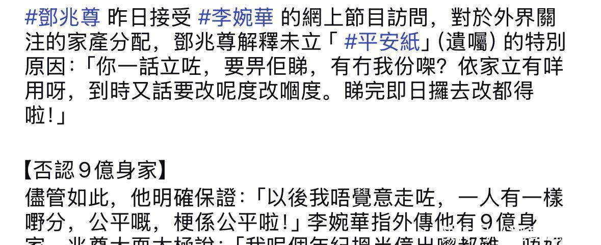 邓兆尊禁受李婉华的网上电台采访,聊得最多的照旧他跟那三位女友的事。不外此次采访没藏着掖着,获胜问到他将来的安排。巨匠皆知说念他依然58岁了,诚然还算中年,但也不算年青了,没到要赶快立遗嘱的阶段。可谁又能保证将来不会瞬息走掉?是以他对后事照旧有所探究,也作念了一些盘算推算。在被问到财产怎样安排时,他直言咫尺还没立遗嘱,原因很节略,一来本事还早,立了归正要改;二来他有三个女友,如若确切立了遗嘱,细目会激起巨匠的兴趣心,容易引起争持,还不如别动那份心。
