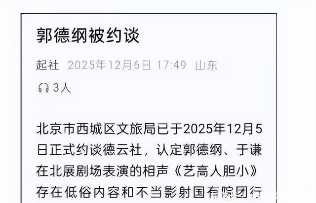 随后,12月初有截图暴露,西城区文旅局回复了投诉,阐明献艺中有些砸挂调和音梗涉嫌低俗瞻念,也曾对德云社进行了品评教诲和约谈。 条目整改台本,以后别再用容易引起负面公论的台词。 大师心里齐判辨,这约谈一出,就等于官方层面盘曲给《艺高手顾虑》里头的“低俗”推行盖了章。