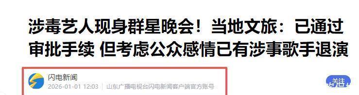 闪电新闻2026-01-01《涉毒艺东谈主现身群星晚会!当地文旅:已通过审批手续 但辩论公众情谊已有涉事歌手退演》