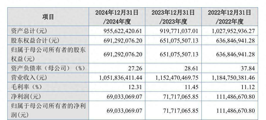 功绩方面,招股书表现,解说期(2022年至2024年)各期,陕西瑞科的买卖收入分袂为11.85亿元、11.52亿元、10.52亿元;归母净利润分袂为1.11亿元、7171.71万元、6903.31万元,呈逐年下滑趋势。