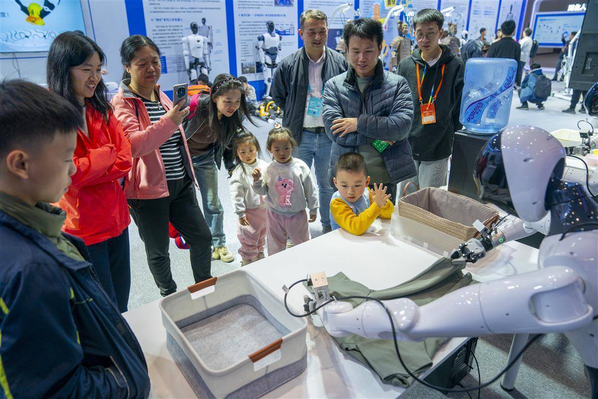 11月22日,中国光谷科技会展中心,不雅众在湖北东谈主形机器东谈主创新中心展台参不雅,东谈主形机器东谈主“扮演”叠衣技能。(湖北日报全媒记者 魏铼 摄)