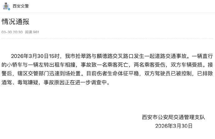 30日晚,记者从西安市交警部门了解到,今日15时,西安市拾翠路与麟德路交叉路口发生沿途说念路交通事故。一辆直行的小轿车与一辆左转出租车相撞,事故致别称乘客升天,两名乘客受伤,两边车辆受损。